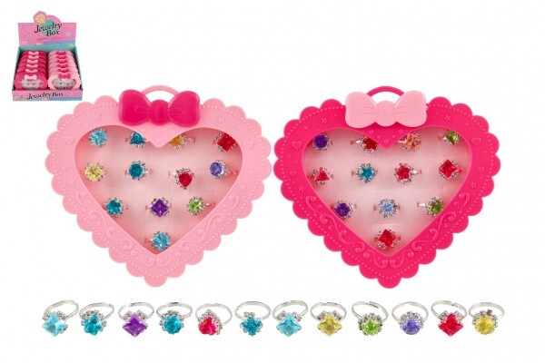 Prstýnek/Prstýnky s kamínkem kov/plast 12ks nast. velikost 2 barvy v krabičce tvar srdce 12ks v boxu
