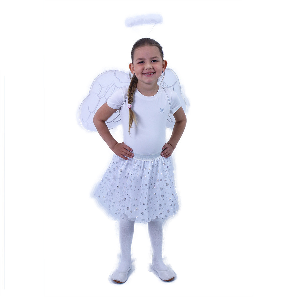 Krásná andělská sada pro malé holčičky! Sada obsahuje bílá křídla, TUTU sukýnku se stříbrným dekorem a čelenku. Sukýnka je v pase na gumu.