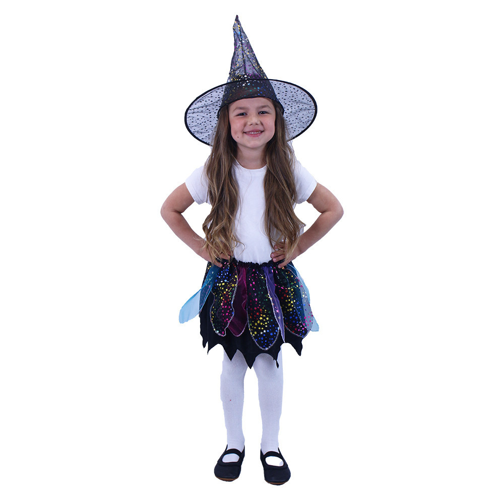Kostým je laděný do elegantní černé barvy, kterou oživuje veselý barevný dekor. Sukně je nadýchaná, díky čemuž vypadá velmi efektně a dělá radost při pohybu. Díky gumičce v pase je sukně pohodlná a snadno se obléká, vhodná pro děti ve věku 3 až 10 let. Celý set doplňuje sladěný čarodějnický klobouk, který podtrhne kouzelný vzhled malé čarodějky.