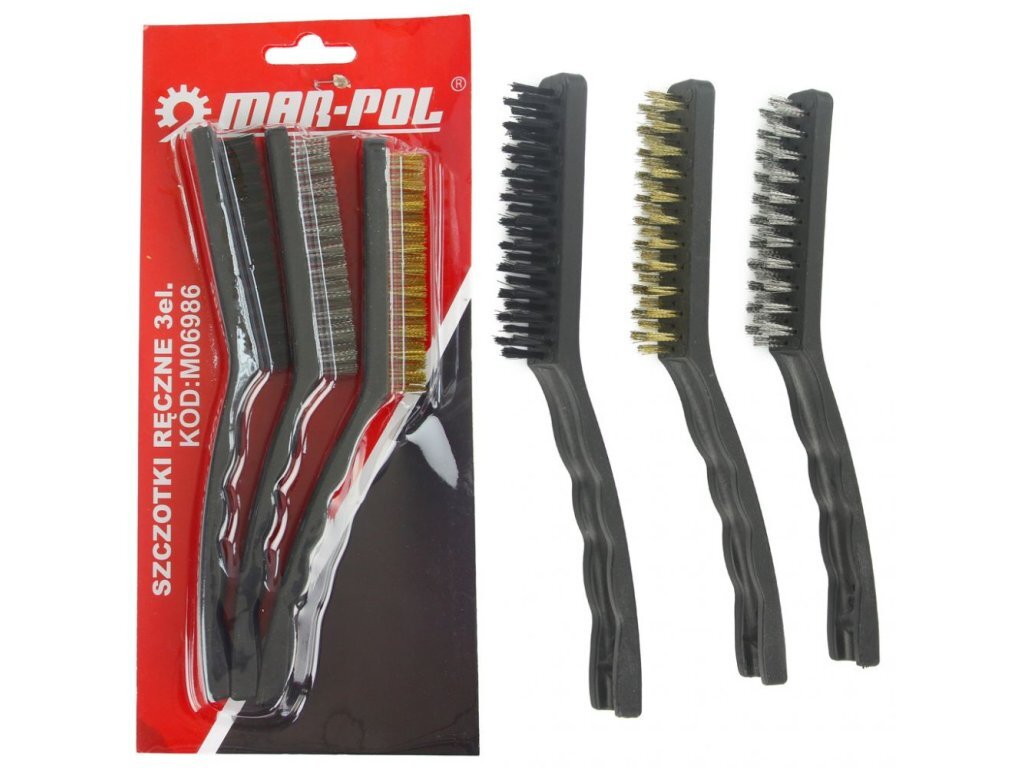 Sada 3 technických kartáčů z ocelového drátu, mosazného drátu a nylonu. Rukojeti kartáčů jsou vyrobeny z tvrdého plastu. Celková délka kartáčů je 210 mm. Kartáče jsou určené k odstranění nečistot z různých materiálů.