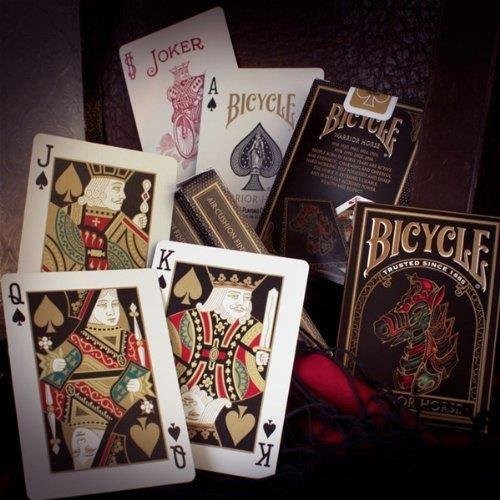 Karty Bicycle Warrior Horse to unikalna talia 55 kolorowych kart. Przygotowana z okazji chińskiego roku konia jaki przypada na 2014 rok. Karty przedstawiają unikalny projekt głowy konia wojownika. Figury są dopasowane kolorystycznie do koszulki. Kolory złoty przepleciony jest z czarnym i odcieniami czerwieni i zieleni.