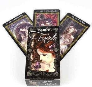 Karty Tarot Favole z ilustracjami hiszpańskiej artystki Victorii Francs. Przepiękne obrazy Wielkich Arkanów i kart dworskich czynią z nich prawdziwą perełkę dla miłośników gotyckich obrazów i talentu ich autorki. W talii Favole Tarot Małe Arkana przedstawione zostały w sposób marsylski. I tak buławy zastępują krzyże, puchary to kwiaty, miecze to motyle, a denary są maskami. Zrozumienie talii może okazać się trudne dla osób rozpoczynających naukę Tarota, lecz na pewno znajdą się osoby, które po jej poznaniu zapragną rozpocząć swoją przygodę z Tarotem... Rewelacyjne karty do tarota. Wyprodukowany przez hiszpańską firmę Fournier. W talii znajdują się 78 karty o wymiarach 110 x 60 mm.