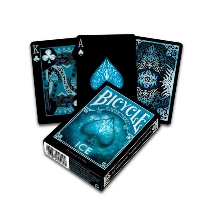 Kompletně upravené karty Bicycle Ice vás zchladí svým mrazivým designem. Ledově modrá barva v kombinaci s bílou na černém pozadí vypadá opravdu dobře, navíc se jedná o hodně neobyvklou barevnou kombinaci. Všechny lícové karty jsou modré (srdce a káry jsou tmavší), což znamená, že v tomto balíčku není klasický kontrast mezi černými a červenými kartami. Ale tohle v žádném případě není klasický balíček karet!