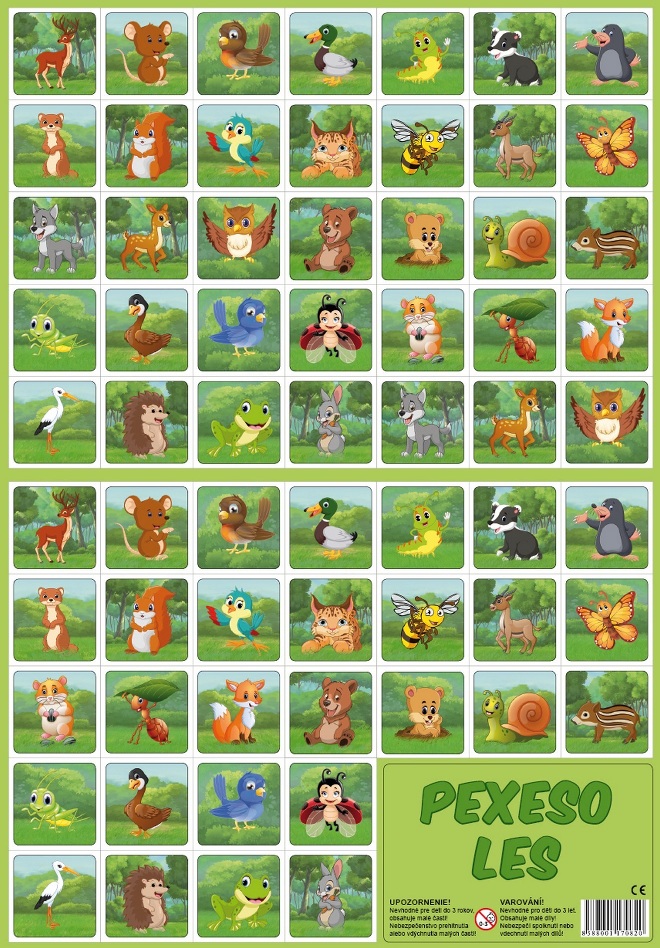 Společenská hra, při které si děti hravou formou trénují svou paměť. Hra se po rozstříhání skládá z 32 obrázkových dvojic. Pexeso 32 dvojic s obrázky kreslených zvířátek z lesa. Rozměr: 24,5 x 34,5 cm Vhodné pro děti od 3 let