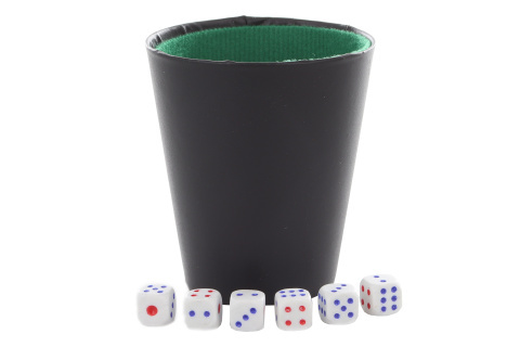 Hraci kostky s kelímkem - balení obsahuje šest kostek o velikosti cca 1,2 cm.Rozměr plastového kelímku uvnitř vypolstorvaného filcem cca 8 cm.Výrobek není hračka.