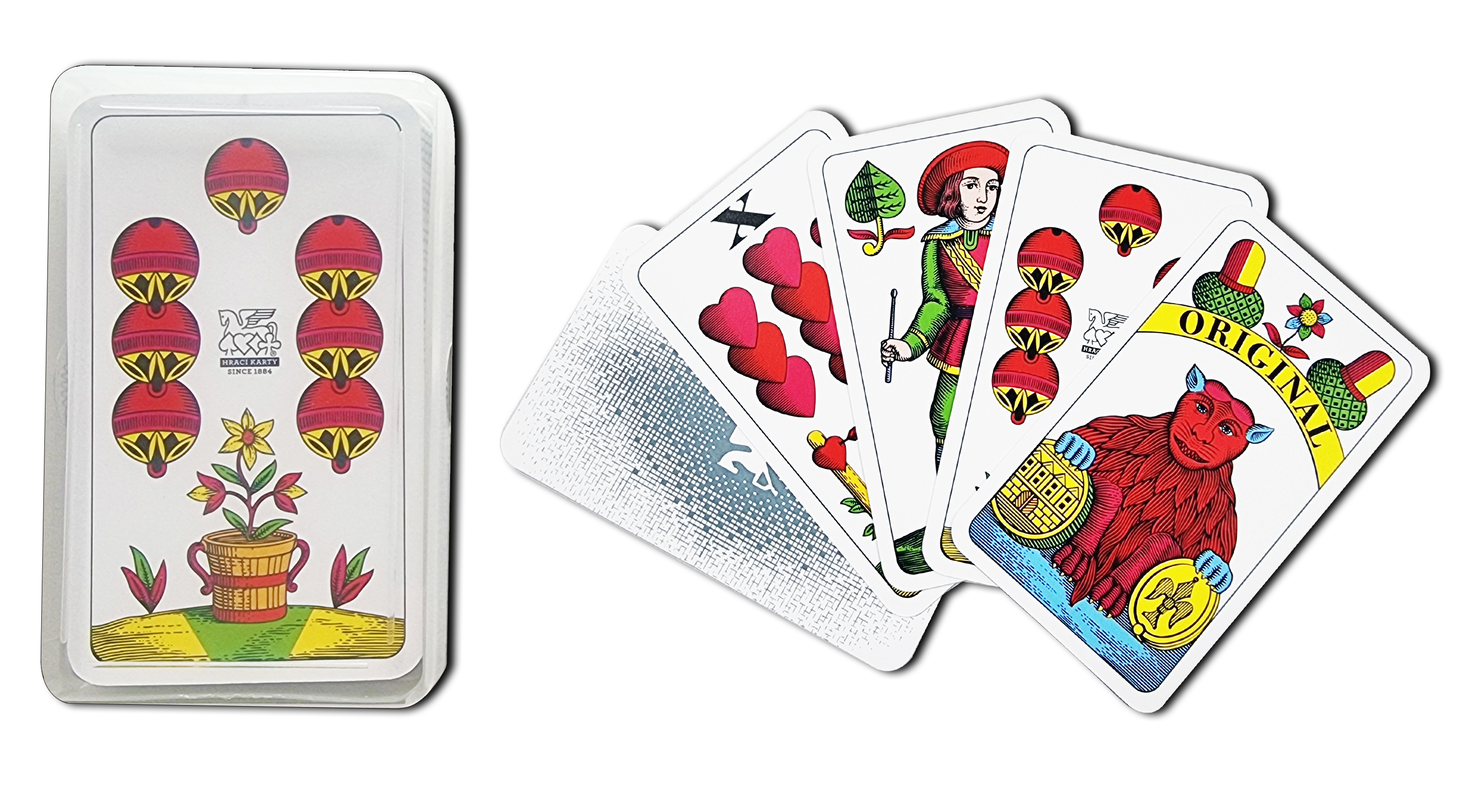 …naše hra vychází z tradičního karetního vzoru ve světě známého jako „pražský typ“. Tváří této hry je již 200 let žaludské eso s medvědem držícím dvě mince. Revers hry s bájným Pegasem je pro tuto hru charakteristický již více jak 50 let. No.1512, revers koník, krabička plast počet 32 listů formát karet 62/104 mm papír Casino Classic 310 g/m2