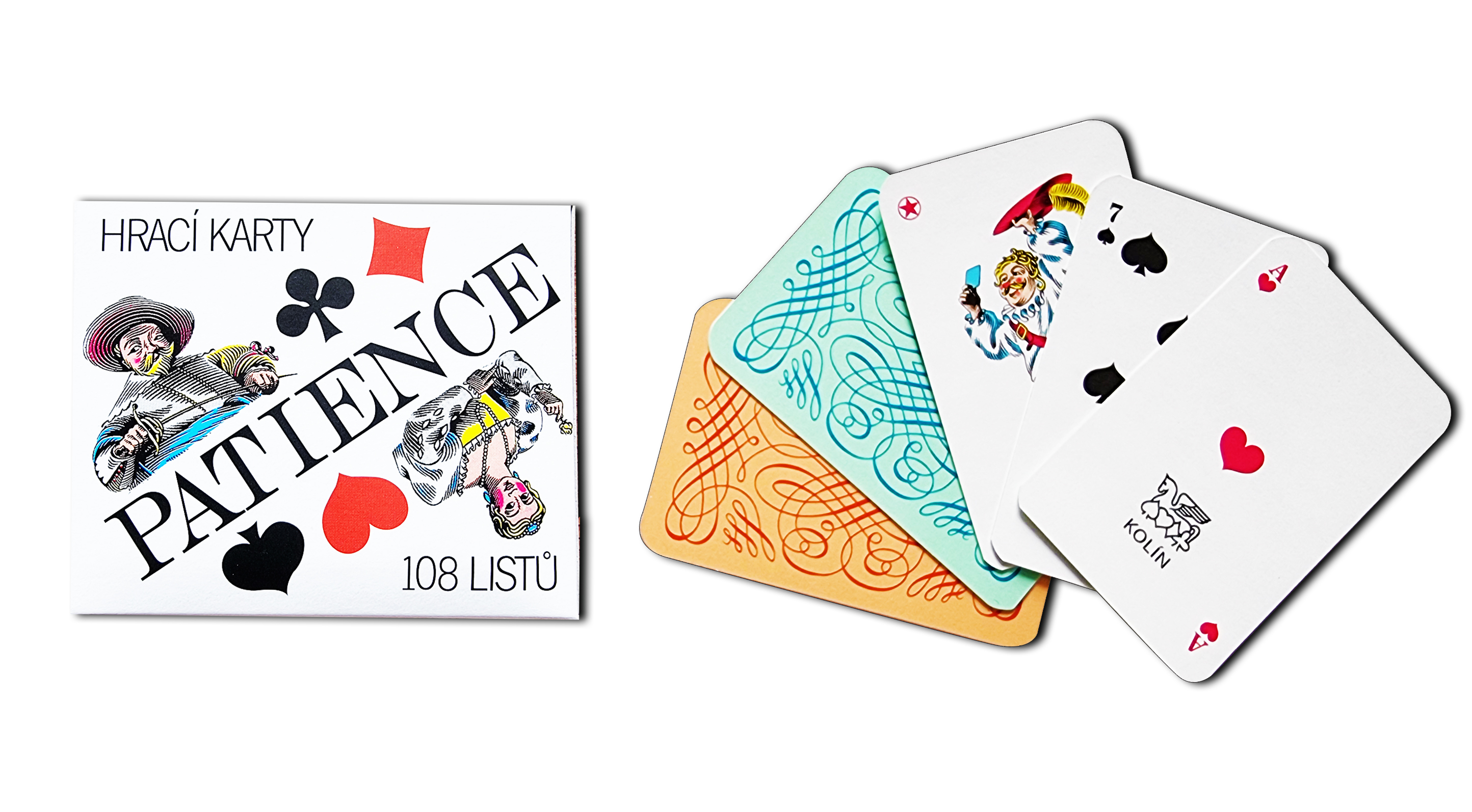 …naše hra zachovává praktický malý formát karet v původním designu českých pasiánsových karet. Legenda říká, že na pikovém králi je zobrazen slavný český herec Jan Werich v roli císaře Rudolfa II. ve filmu „Císařův pekař a pekařův císař“. S touto hrou je neodmyslitelně spjat ornamentální revers. No.1617, revers ornamenty, krabička papír počet 108 listů (dvě hry x 54 listů) formát karet 44/68 mm papír Casino Classic 310 g/m2