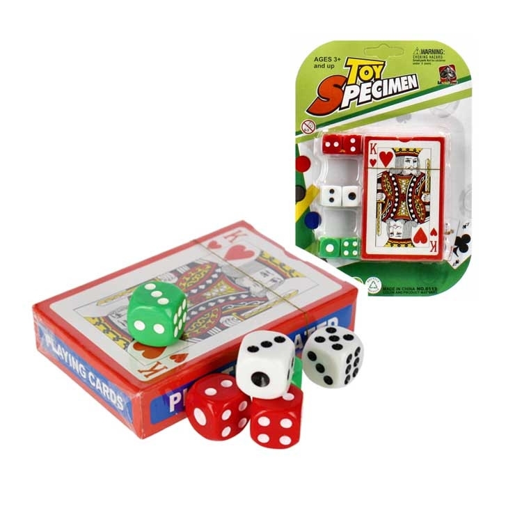 Kostky a karty, obsah sady je 6 kostek ve třech barvách a hrací karty. Rozměry balení jsou 13x19x2cm. Určeno pro děti ve věku: 3+. číst celé