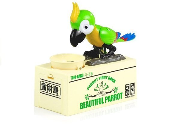 Po vhození mince do otvoru pokladničky, v tomto případě misky na jídlo, papoušek stojící nad ní začne vyvádět skutečné psí kusy. Vrtět se, „hltat" vhozený peníz a honit ho kolem dokola misky.