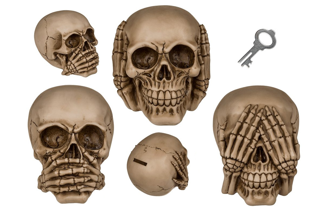 Stylová pokladnička s oblíbeným motivem lebky. Dodáváme ve třech variantách, zakryté oči, uši, ústa - variantu posíláme podle skladových zásob. Pokladnička, lebka - tři opičky (nekouká, neslyší, nemluví). Rozměry: 15x10 cm. Materiál: Polyresin.