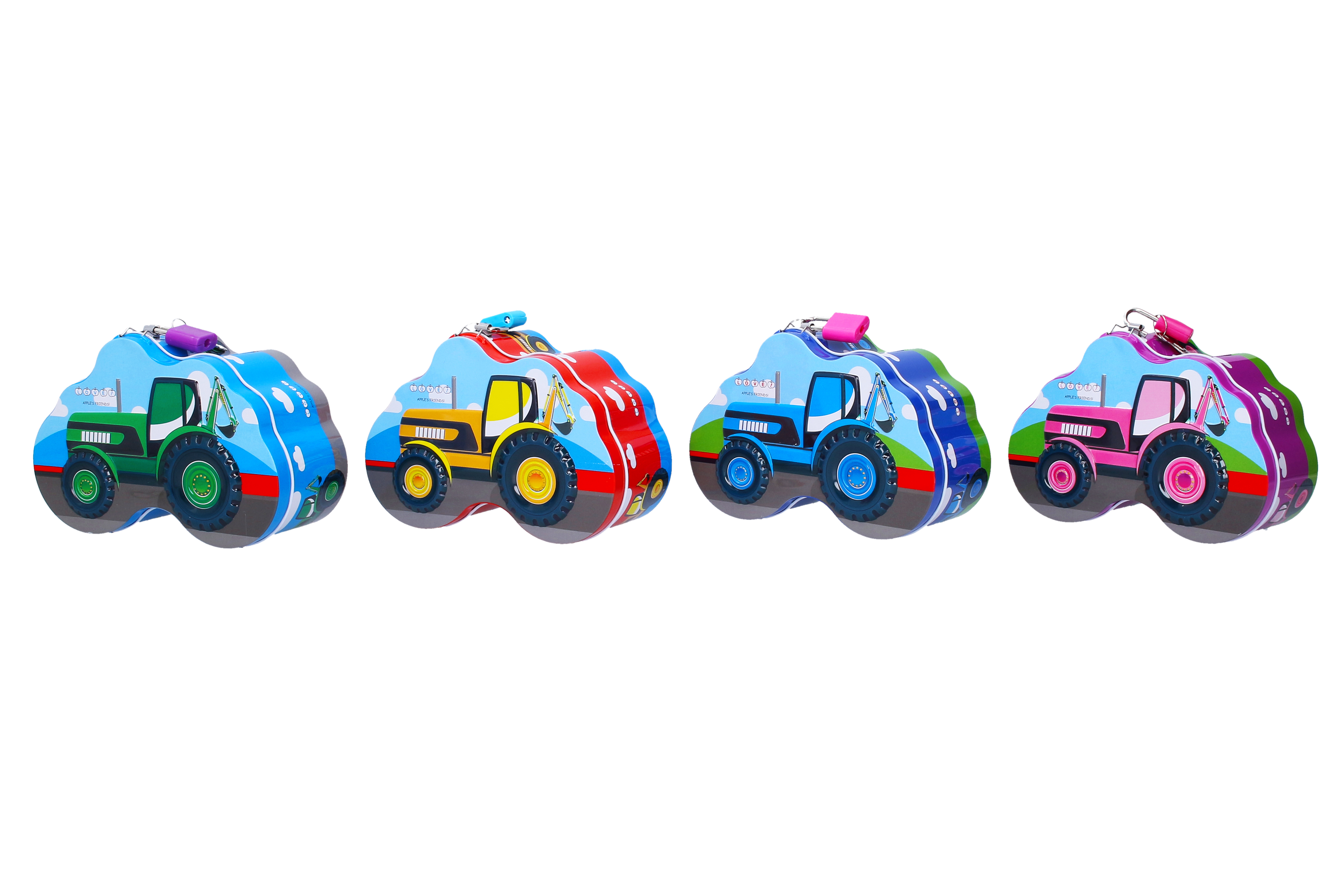 Tato plechová pokladnička ve tvaru traktoru je nejen vkusným dekorativním prvkem, ale také praktickým pomocníkem pro ukládání mincí či drobných bankovek. Je pevná a odolná, díky čemuž snadno unese vaše úspory a zároveň si zachová svůj atraktivní vzhled. Velikost 14x10 cm je ideální, abyste ji mohli umístit na polici, stůl nebo do dětského pokoje jako motivaci k ukládání peněz.