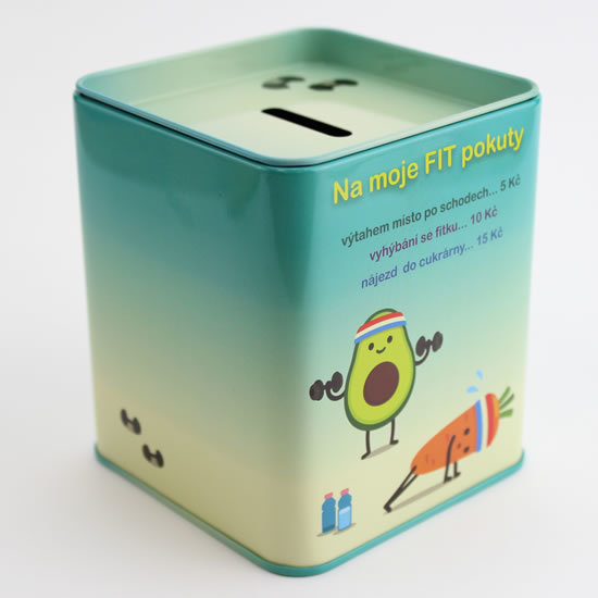 Plechové pokladničky s vtipným potiskem pro různé příležitosti. Odnímatelné víko s otvorem na mince. Rozměry: 8,5 x 10 cm.