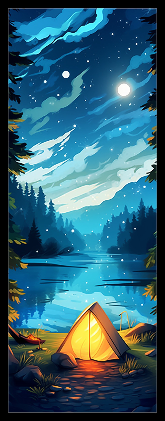 Tato záložka ze série Kempování s názvem Hvězdná nádhera zachycuje pohádkovou scenérii nočního tábořiště. V údolí se rozprostírá klidné jezero, jehož hladina odráží jasné hvězdy. Osvětlený stan v popředí vyzařuje teplé světlo, které jemně zvýrazňuje okolní krajinu. Jak noc postupuje, obloha se mění v nekonečnou klenbu plnou třpytivých hvězd, které vyprávějí své dávné příběhy.