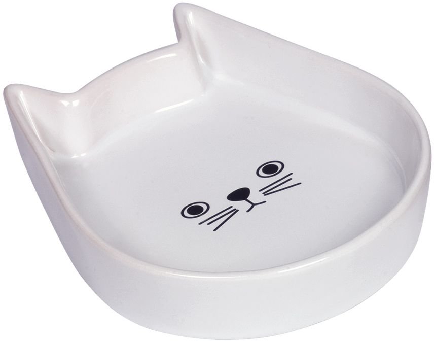 Keramická miska Nobby pro kočku. Speciální tvar misky v podobě hlavy kočky. Velikost 13 x 16 cm, výška 3 cm. Barva bílá. Miska by se měla umýt po každém krmení, protože kočky mohou odmítat jíst z misky, ve které cítí zbytky. Kočičky mají raději, když miska s krmením není umístěna v blízkosti misky s vodou Upozornění: Před prvním použití umyjte důkladně pod vodou.