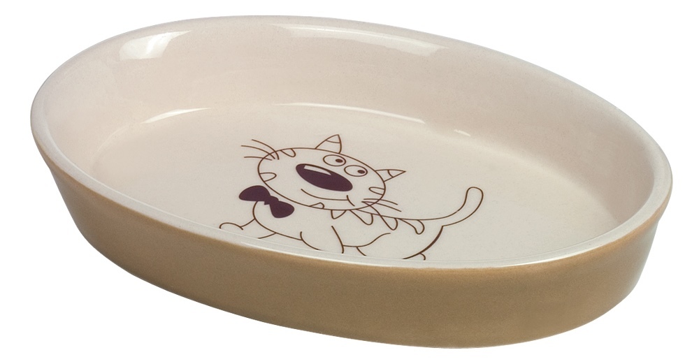 Vyrobená z robustní keramiky. Vhodné do myčky nebo mikrovlnné trouby. Tato miska má poměrně velkou vlastní váhu, díky čemuž je stabilní a dobře drží na jednom místě. Velikost 17 x 11 cm, výška 2,5 cm. Miska by se měla umýt po každém krmení, protože kočky mohou odmítat jíst z misky, ve které cítí zbytky. Kočičky mají raději, když miska s krmením není umístěna v blízkosti misky s vodou