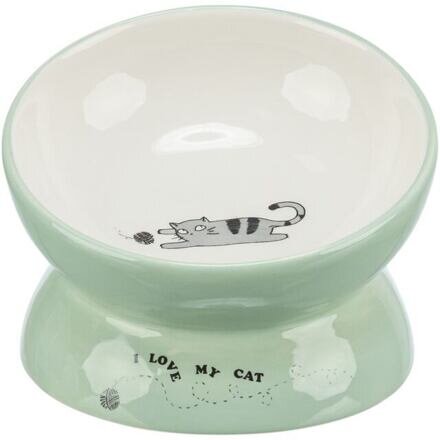 Keramická miska vyvýšená s motivem kočky, ergonomický tvar, 0,15 l / 13 cm, šalvěj/bílá
