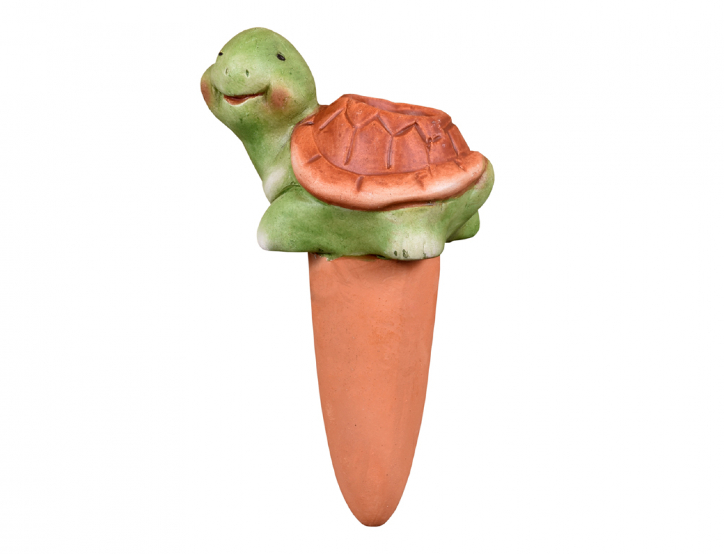 Dávkovač vody do květníků. Praktický pomocník na doplnění závlahy rostlin v případě, že chceme na několik dní opustit domov nebo si péči o rostliny zjednodušit. V zadní části dávkovače se nachází otvor pro doplnění zálivky, zatímco v přední nadzemní části je ztvárněn do podoby želvy. Materiál: přírodní terakota, umožňující díky nasákavosti postupné propouštění závlahy ke kořenům rostlin. Rozměry: délka: 9 cm, výška 14 cm, hloubka: 5 cm. MOM: 4. Barva: zelená.