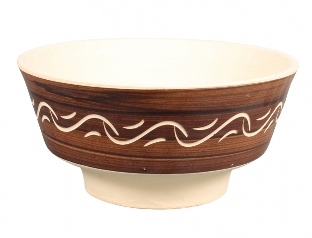 Tato přírodní kameninová žardinka má užší nohu a širší horní pás, který je zdoben hnědými glazovanými pruhy doplněnými středovým bílým pruhem s jemnými nepravidelnými vrypy. Tento výrazný dekor přidává produktu na estetické hodnotě a dává mu charakter, který skvěle vynikne jak v interiéru, tak i v exteriéru.