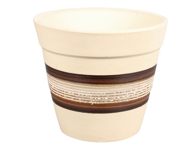 Keramický béžový květník se zdobením po obvodu ve prostřed výšky. Vedou zde 2 hnědé glazované cca 1cm široké proužky, mezi kterými je bíle glazovaný pruh tvoření nepravidelnými vrypy po obvodu. Květník je vhodný do interiéru i exteriéru. Šířka: 23 cm, výška: 20 cm, výška: 23 cm. Vhodnou podmiskou...