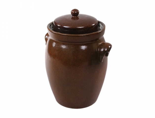Keramický glazovaný hnědý lesklý 10l zelák s víkem a s uchy. Zelák je v půdorysu kruhový. Tvar má kónický, kdy se v horní části, kde jsou připevněná keramická ucha začne opět uzavírat. Horní ohraj je poté kolmý rovný pruh. Na něm je položené víko. Zelák se používá ke kvašení a skladování zelí a pro jinou podobně zpracovanou zeleninu. Rozměry: d. 30 x v. 32cm.