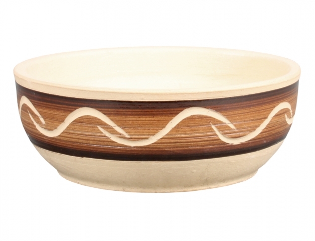 Tato přírodní keramická žardinka v béžovém odstínu nabízí originální design s menší základnou, která se směrem vzhůru rozšiřuje až do téměř válcového tvaru. Jemně vystouplý horní okraj je obohacený o hnědý glazovaný pruh se třířadým rytým vlnkovým vzorem, který podtrhuje její rustikální charakter a dodává jí osobitost.