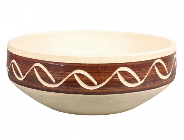 Keramická béžová žardinka s menší základnou, která se poté prudce rozevře až téměř do válce s jemně vystouplým horním okrajem, pod kterým je hnědý glazovaný pruh s vyrytými vlnami až na keramiku ve 3 řadách. Žardinka je vhodná do interiéru i exteriéru. Šířka: 34 cm, výška: 13 cm, hloubka: 34 cm. Vhodnou podmiskou je CAMPANULA, NG 053854hb.