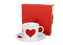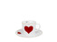 Filiżanka zdobiona ogromnym sercem w kolorze soczystej czerwieni na białym tle.