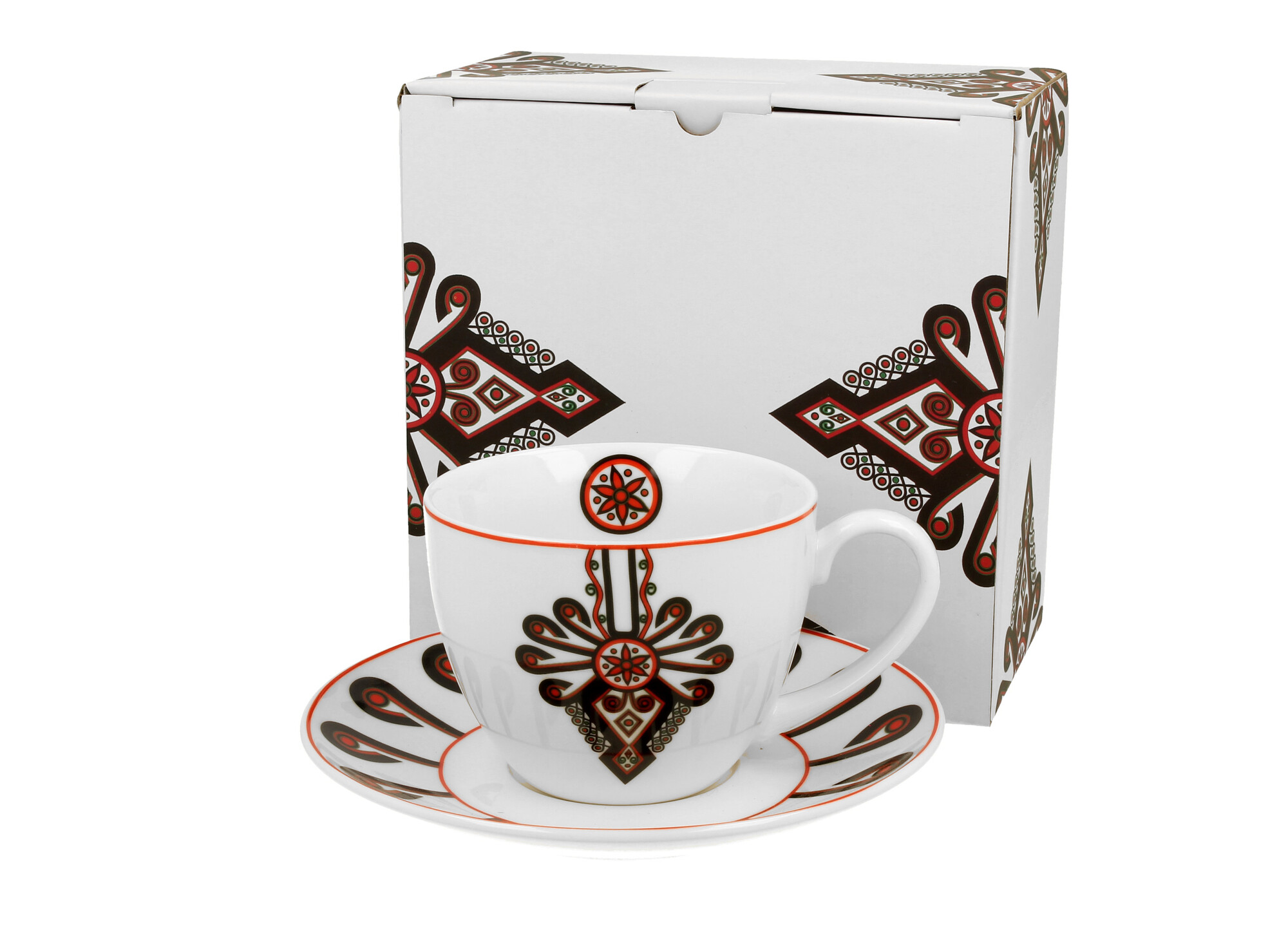 Linia zdobiona typowo regionalnym motywem podhala - haftu parzenicy w intensywnym kolorze czarno-czerwonym idealnie komponujacym się z białym tłem porcelany.