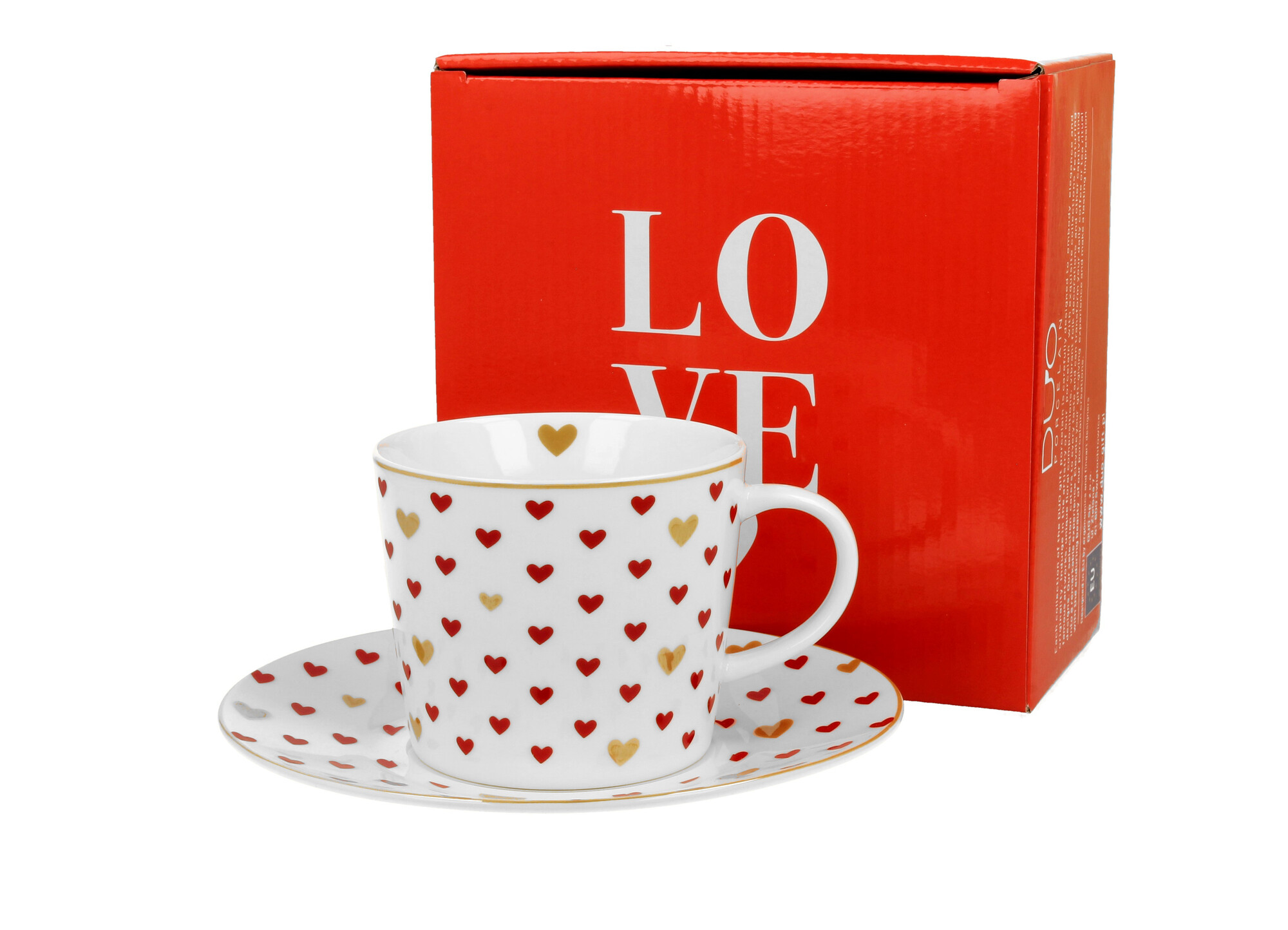 Linia zdobiona malutkimi czerwonymi i złotymi serduszkami, rozsypanymi po całej powierzchni. Połączenie czerwieni z bielą porcelany tworzy harmonijną kompozycję.