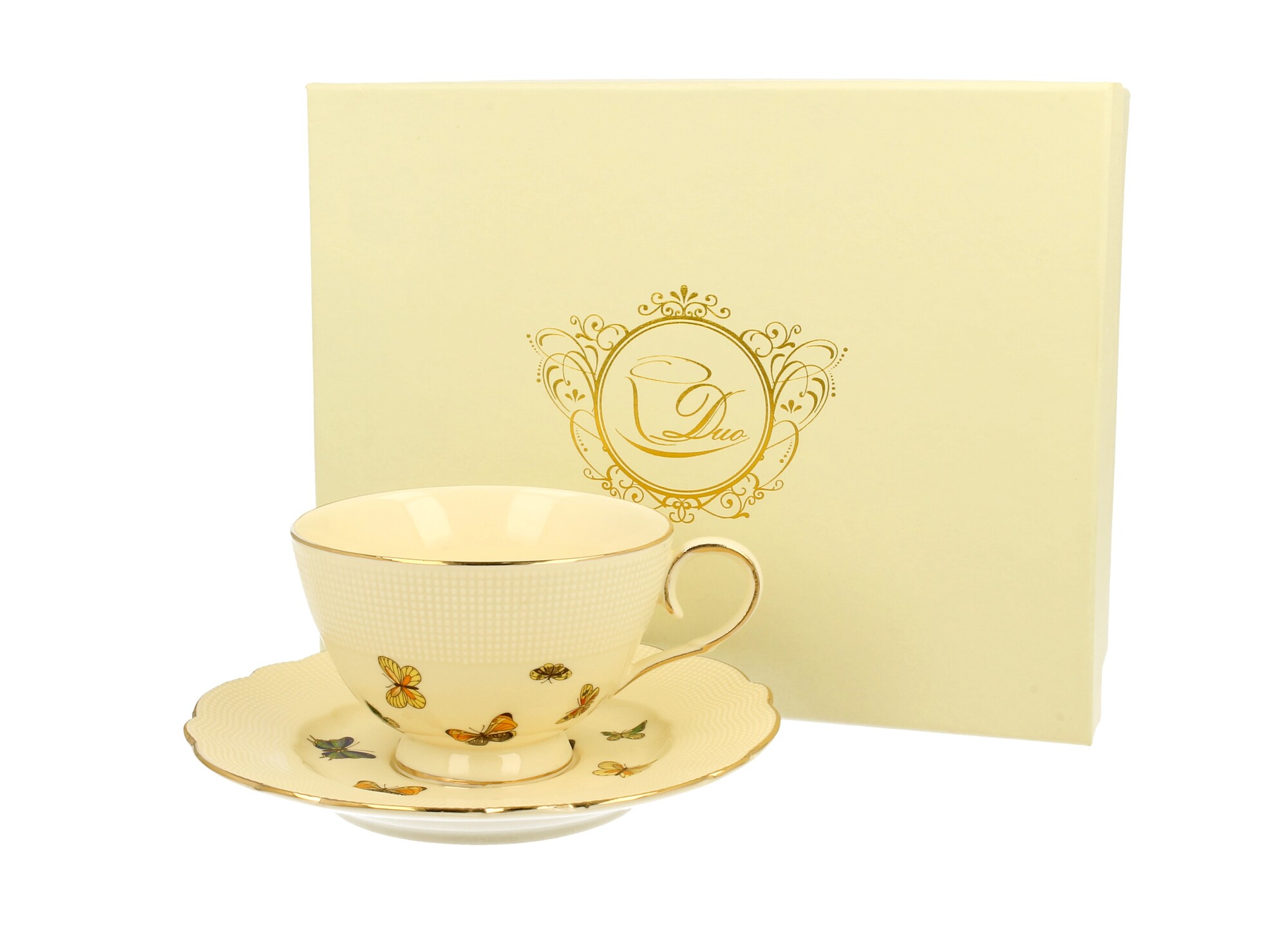 Filiżanka ze spodkiem MOTYLKI wchodząca w skład kolekcji ECRU. Wykonana z najwyższej jakości porcelany w kolorze śmietankowym wykończonej złotymi zdobieniami oraz motywem kolorowych motyli. Całość zapakowana w eleganckie ozdobne opakowanie stanowi doskonały pomysł na prezent.
