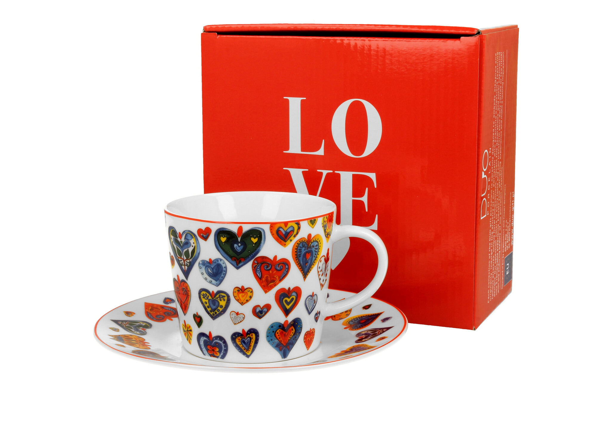 Filiżanka ze spodkiem KOLOROWE SERCA 3 wchodząca w skład serii SERCA, wykonana z porcelany New Bone China, charakteryzującej się elegancką i naturalną kremowo - białą barwą z delikatnym połyskiem, a także wyjątkową wytrzymałością.