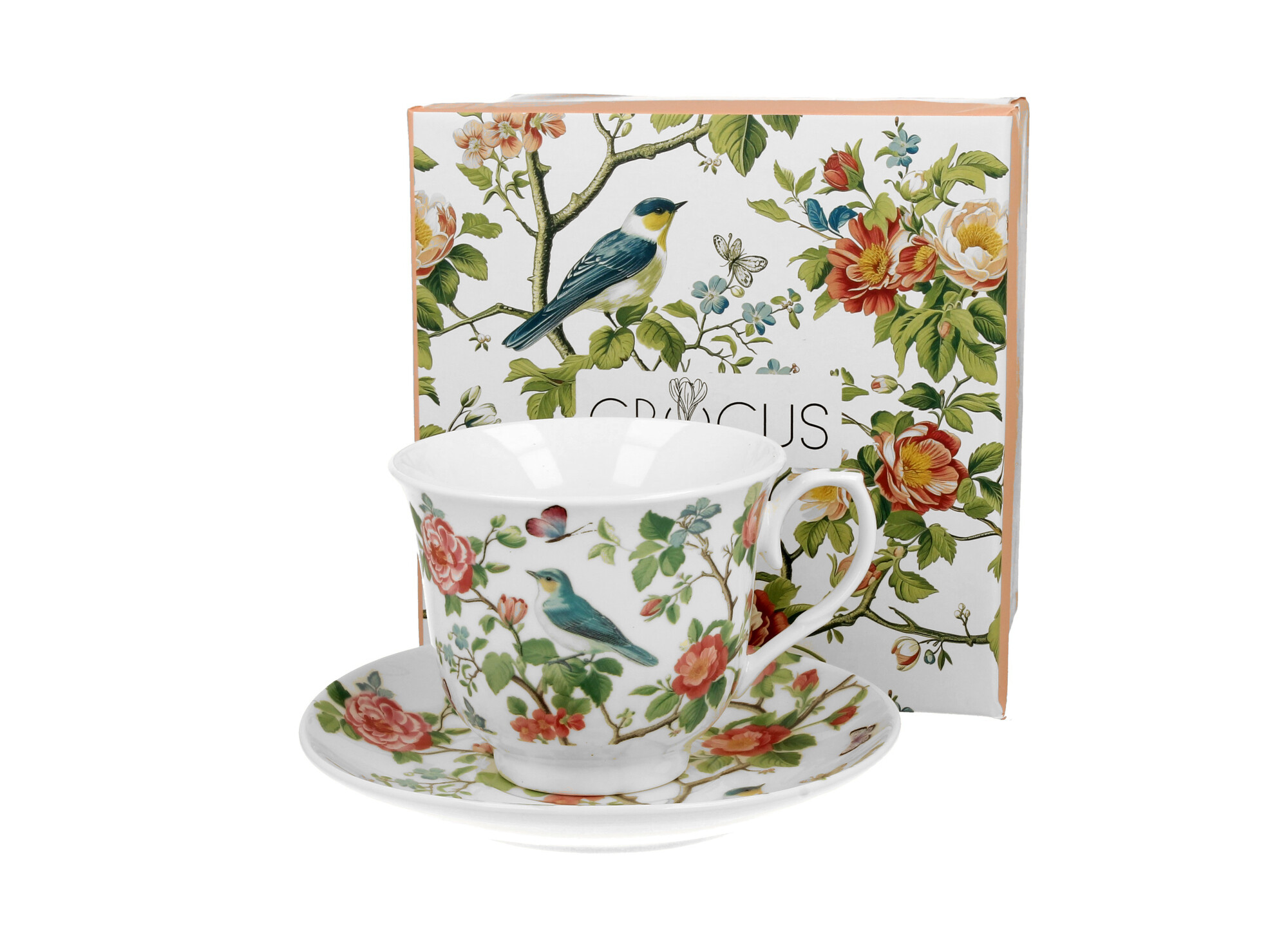 Filiżanka ze spodkiem PTAKI NA GAŁĘZI wchodząca w skład serii CROCUS, wykonany z porcelany New Bone China, charakteryzującej się elegancką i naturalną kremowo - białą barwą z delikatnym połyskiem, a także wyjątkową wytrzymałością.