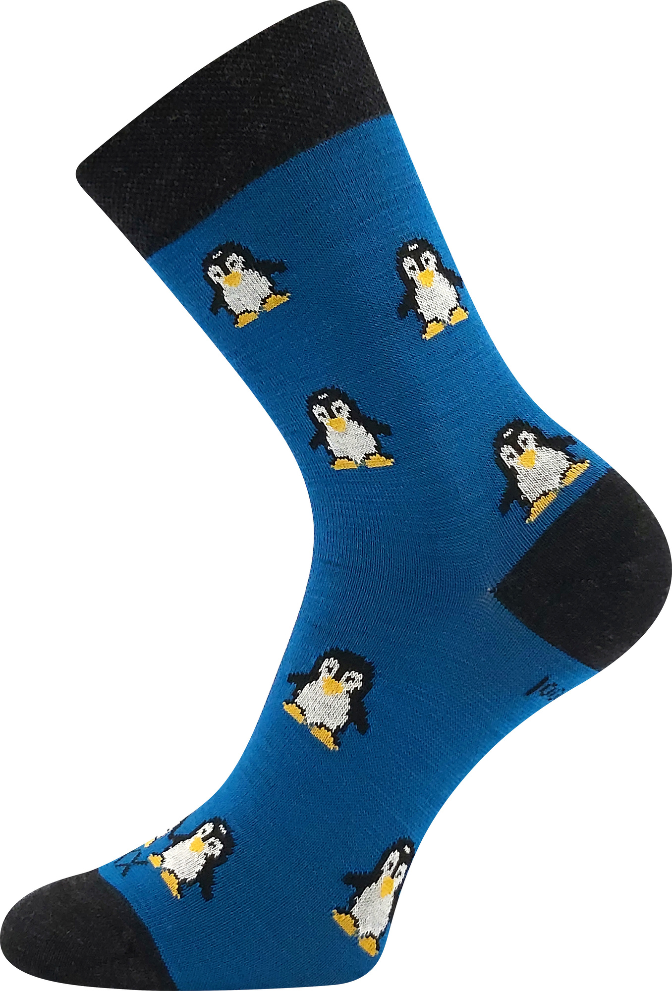 Dámské vlněné merino ponožky VoXX® SNĚŽENKA s vtipnými obrázky tučňáků jsou roztomilé na první pohled. Zároveň jsou odolné proti opotřebení, mají vyztuženou špičku a patu. Teplé slabé ponožky mají špici uzavřenou řetízkováním, takže nikde netlačí. Materiály merino vlna a silproX® s ionty stříbra jsou přirozeně antibakteriální, omezují tvorbu bakterií a plísní - ty jsou v ponožkách přirozeně zničeny a nedochází pak k tvorbě zápachu. Ve vlněných ponožkách už studené nohy rozhodně mít nebudete, ponožky mají teplotní třídy B-C.