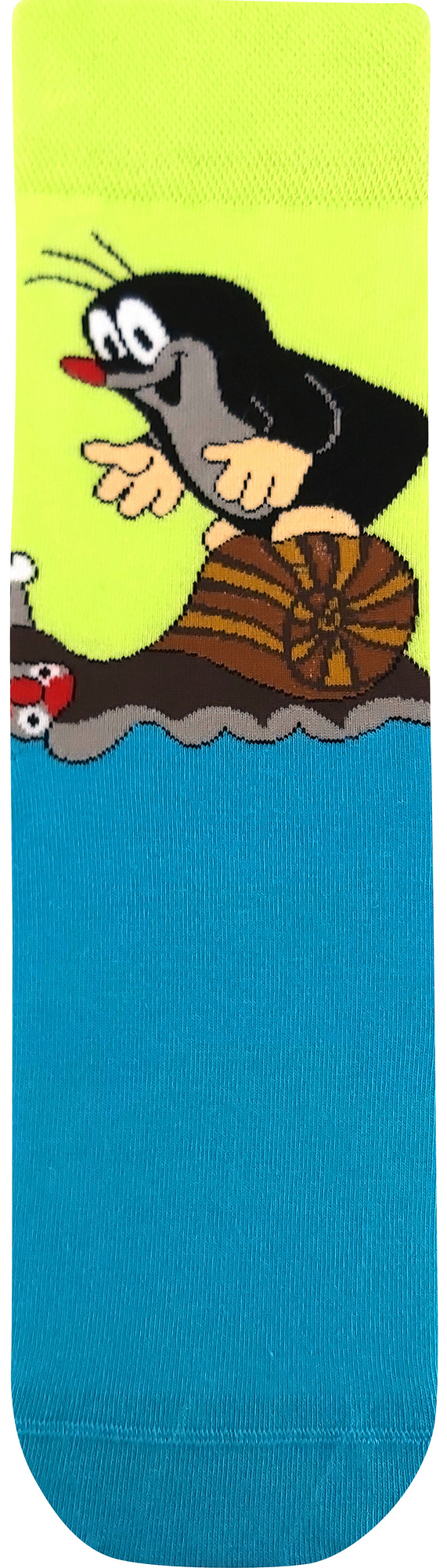Dámské a pánské vtipné ponožky Boma® KR 211 jsou slabé ponožky s roztomilým obrázkem Krtka od malíře Zdeňka Milera. Vraťte se do říše pohádek a pořiďte si Krtečka do svého šatníku. Klasické ponožky s vysokým podílem bavlny oživí váš outfit, ať už nosíte oblek nebo džíny. 200 jehlový úplet je velmi jemný, vypletený obrázek má díky tomu detaily velmi ostré.
