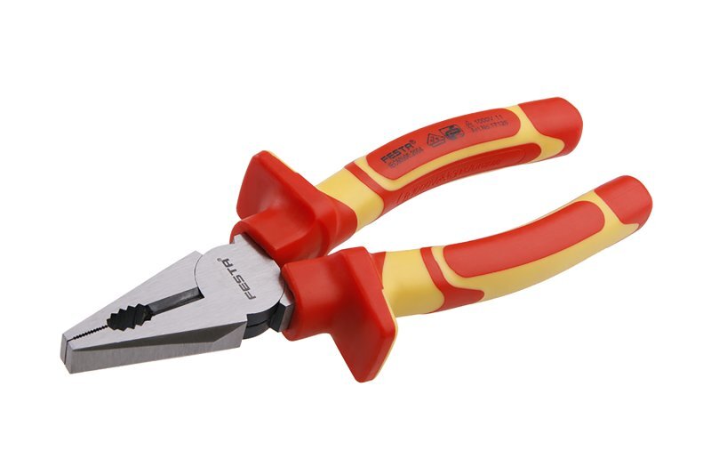 Kleště VDE kombinované 180 mm FESTA mají certifikaci elektro VDE 1000 V, IEC/EN 60900-2004, kombinace polypropylenu a pryže na ergonomicky tvarovaných ručkách zaručuje výborné antiskluzové vlastnosti a dobrou odolnost vůči mazadlům a chemikáliím. Uchopovací čelisti obzvláště odolné proti opotřebení, chromvanadová vysoce výkonná ocel. Hmotnost 0,333 kg.