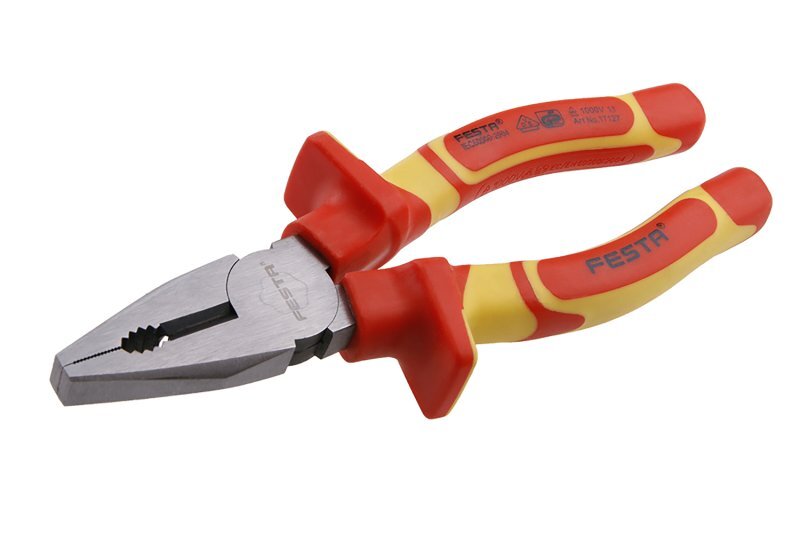Kleště VDE kombinačky 200 mm FESTA mají certifikaci elektro VDE 1000 V, IEC/EN 60900-2004, kombinace polypropylenu a pryže na ergonomicky tvarovaných ručkách zaručuje výborné antiskluzové vlastnosti a dobrou odolnost vůči mazadlům a chemikáliím. Uchopovací čelisti obzvláště odolné proti opotřebení, chromvanadová vysoce výkonná ocel. Hmotnost 0,383 kg.