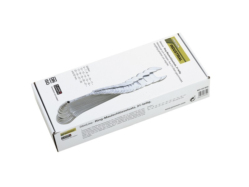 Zestaw profesjonalnych kluczy płasko-oczkowych PROXXON SlimLine. Wykonany zgodnie z nor mmi DIN 3110 oraz ISO 3318.