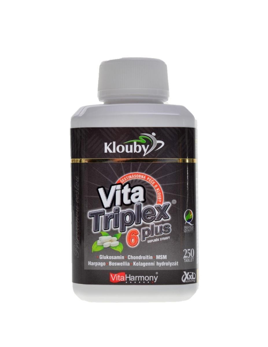 VitaTriplex® 6 plus je osvědčenou kombinací chondroitin sulfátu, glukosamin hydrochloridu, MSM, kolagenního hydrolyzátu, harpago-phytum procumbens a extraktu boswellie serrata. Jednotlivé látky jsou navrženy v biologicky účinných dávkách pro kloubní chrupavky.Chondroitin sulfát a glukosamin jsou látky endogennního původu, které jsou fyziologickou součástí mezibuněčné hmoty chrupavky. MSM (methylsulfonylmethan) je zdrojem tvorby kolagenu a kreatinu. Nová receptura je obohacena o rostlinné extrakty a kolagen. Extrakt z kůry boswellie serrata působí na krevní oběh a tkáně. Dále kořen rostliny harpago zlepšuje vstřebatelnost glukosaminu. Kolagen je důležitou bílkovinou v lidském těle, který podporuje pevnost a pružnost tkání. Kolagen ve formě hydrolyzátu je pro organismus snadno využitelný.