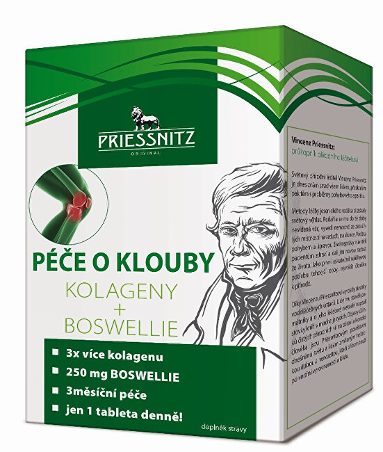 PRIESSNITZ® PÉČE O KLOUBY, přispívá díky obsahu boswellie k podpoře hybnosti a pružnosti kloubů, díky vitaminu C k normální tvorbě kolagenu, pro normální funkci chrupavek, a díky vitaminům K a D k udržení normálního stavu kostí. Dále je péče obohacena o tři, zákazníky žádané, typy kolagenů. Kromě hydrolyzovaných kolagenů typu I a II je tato speciální peče o klouby obohacena také o 40 μg nativního kolagenu typu II. Tedy o kolagen zachovány ve své přírodní podobě.