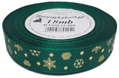 Wstążka metal Śnieżynki, 15mm/18mb, butelka/złoto, Florystyka