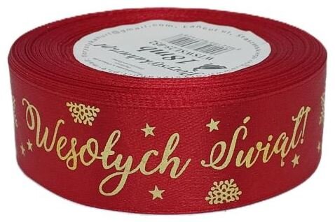 Wstążka metal Wesołych Świąt, 25mm/18mb c.czerw/złoto, Florystyka