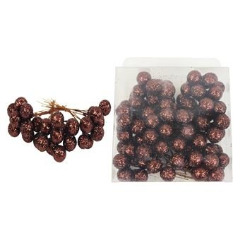 Sada přízdob ve svazcích. Přízdoby jsou na drátě, bobule mají průměr 1,2 cm, výška přízdoby je 5,5 - 6 cm. Krabička obsahuje 10 svazků. Svazek obsahuje 10 přízdob. Barva : hnědá. Materiál : plast. číst celé