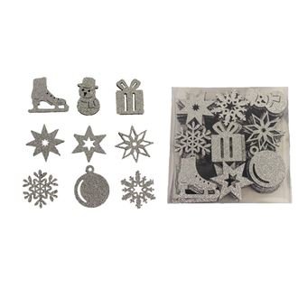 Sada dekoračních přízdob. Sada obsahuje 72 přízdob. Rozměry : 2 - 3,5 x 0,4 cm, výška 3 - ,5 cm. Barva : stříbrná. Materiál : flís. číst celé