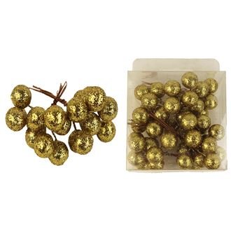 Sada přízdob ve svazcích. Přízdoby jsou na drátě, bobule mají průměr 1,5 cm, výška přízdoby je 7 cm. Krabička obsahuje 5 svazků. Svazek obsahuje 10 přízdob. Barva : zlatá. Materiál : plast. číst celé