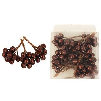 Sada přízdob ve svazcích. Přízdoby jsou na drátě, bobule mají průměr 1,5 cm, výška přízdoby je 7 cm. Krabička obsahuje 5 svazků. Svazek obsahuje 10 přízdob. Barva : hnědá. Materiál : plast.