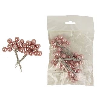 Sada přízdob ve svazcích. Přízdoby jsou na drátě, bobule mají průměr 1 cm, výška zápichu 6 cm. Barva : světle růžová. Materiál : plast.