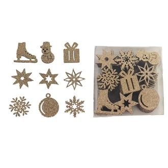Sada dekoračních přízdob. Sada obsahuje 72 přízdob. Rozměry : 2 - 3,5 x 0,4 cm, výška 3 - ,5 cm. Barva : zlatá. Materiál : flís. číst celé