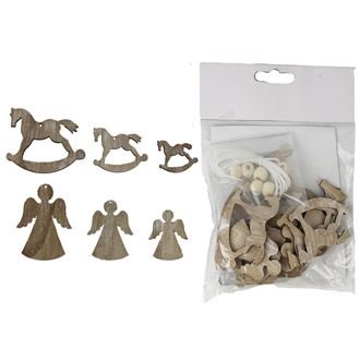 Sada vánočních přízdob v sáčku k zavěšení. Sada obsahuje 12 přízdob, 6 andílků a 6 koníků o třech velikostech. Přízdoby mají šířku 3,5 - 10 cm, tloušťku 0,2 - 0,3 cm, výšku 4 - 8 cm. Sáček obsahuje šňůrky s korálky. Barva : přírodní. Materiál na bázi dřeva.