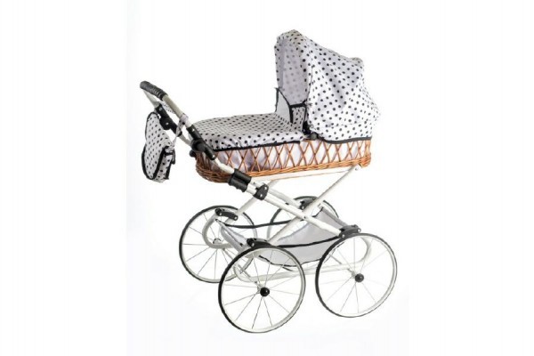 Kočárek v bílé barvě s puntíky a ratanovou postýlkou potěší každou malou holčičku. Stříšku kočárku lze snadno sklopit. Součástí je taška přes rukojeť a praktický košík vespod kočárku. Výška rukojeti: 76 cm, nastavitelná. Vhodný od 3 let.