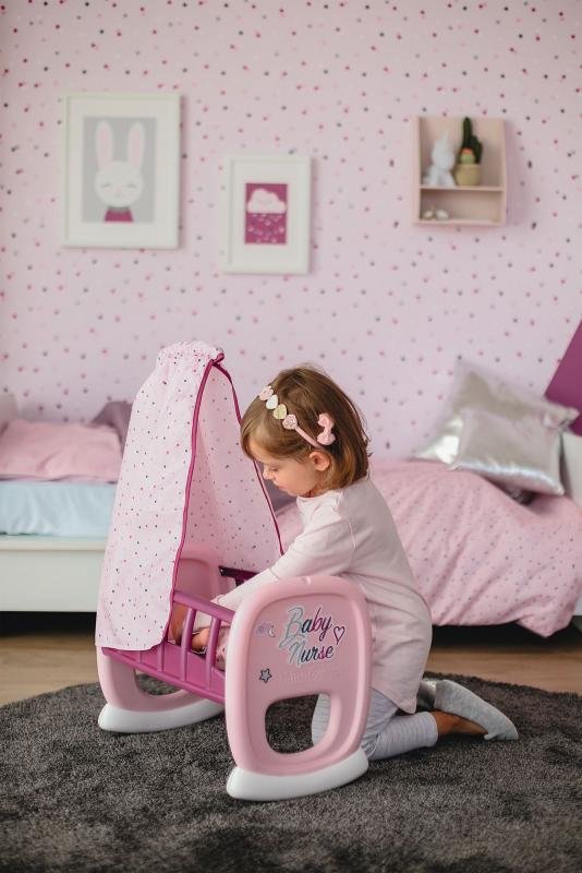 Kolébka pro panenky z řady Baby Nurse s nebesy. Vhodné pro panenky do velikosti 42 cm. Panenka není součástí balení. Rozměry: 46,9 x 27,2 x 68,7 cm. Hmotnost: 1,36